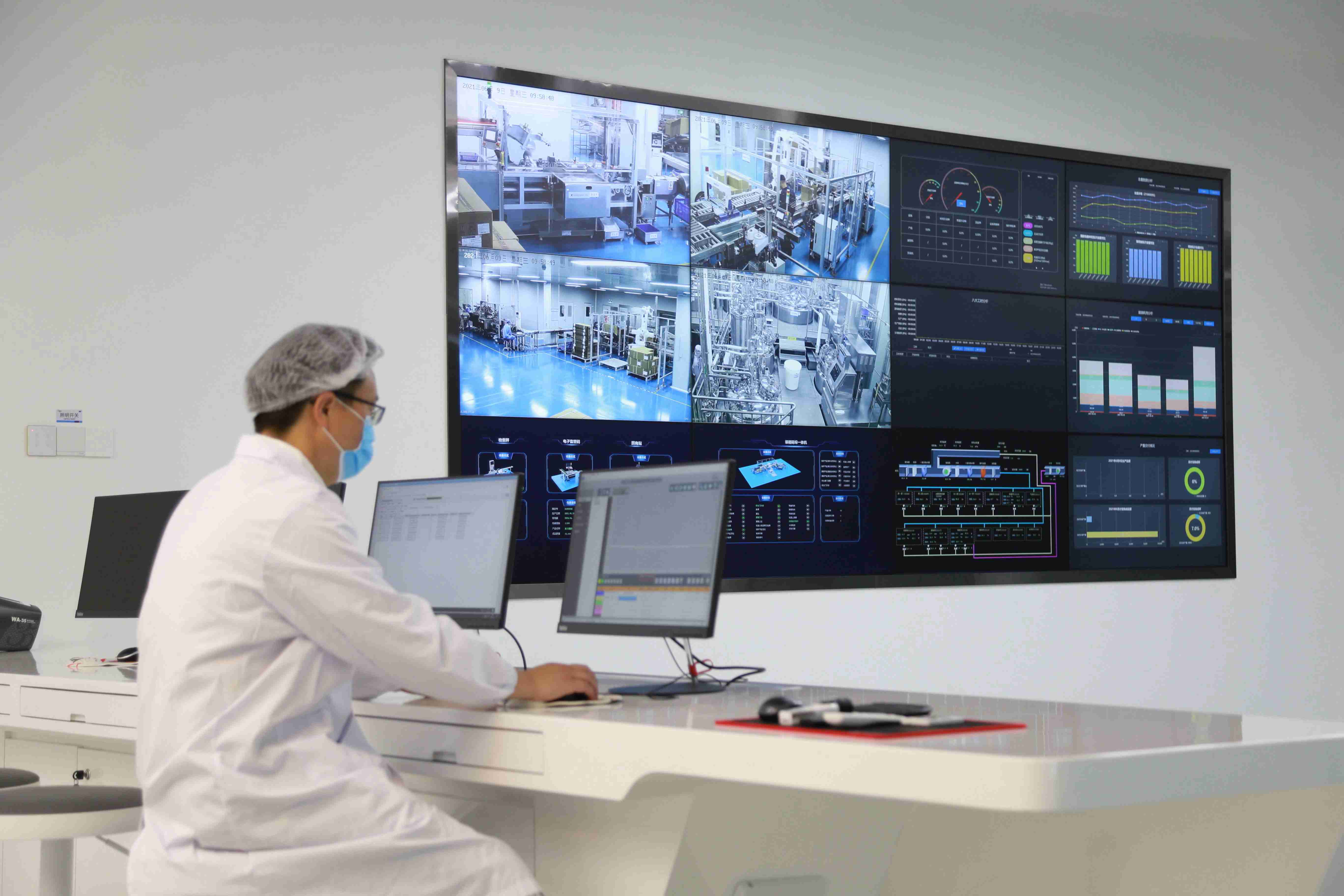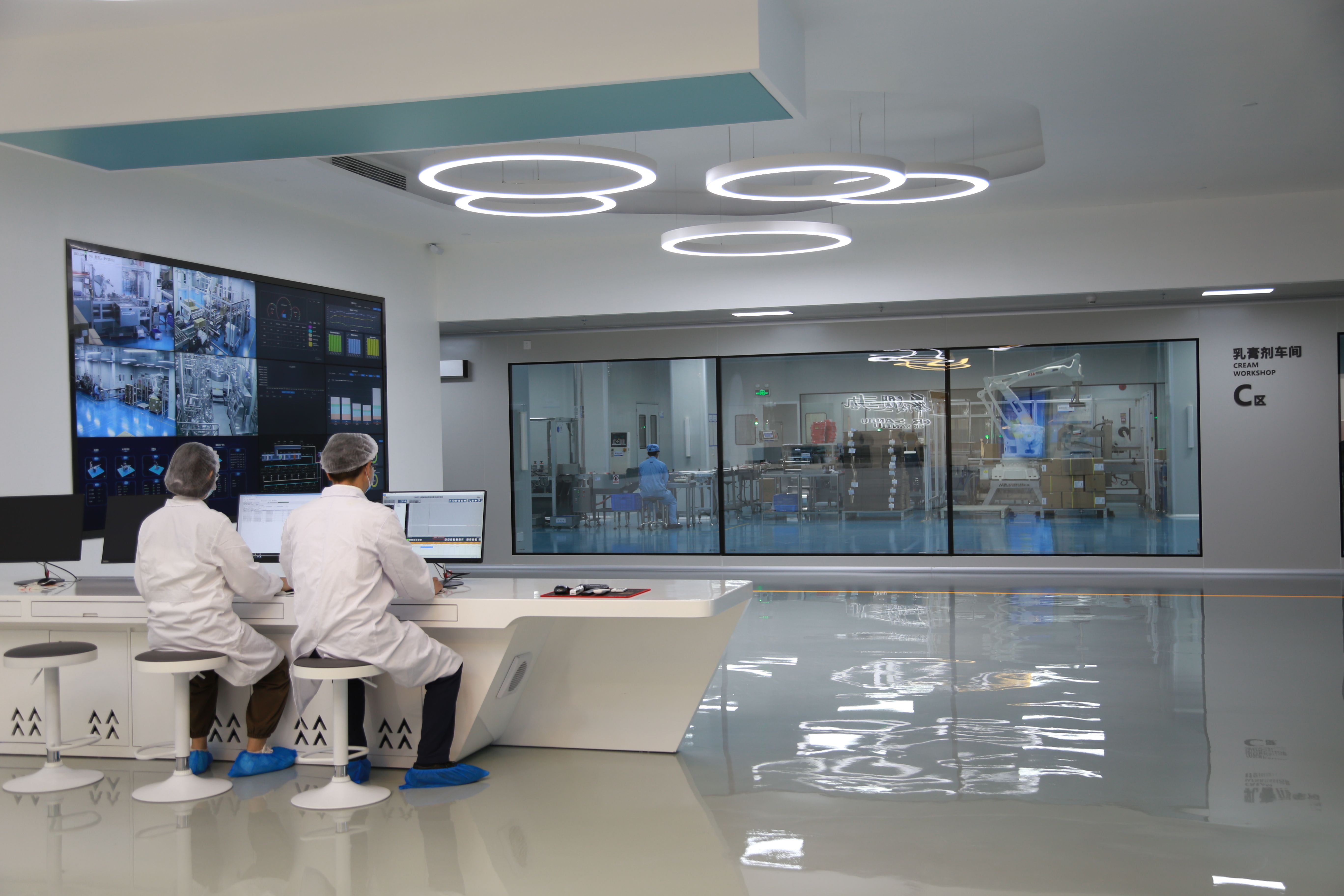×ß½øÈËÉú¾ÍÊDz©¹ÛÀ½Éú²ú»ùµØµÄÖÇÄÜÖÆÔìÖпØÖÐÐÄ£¬¼ÇÕß´Ó¼à¿Ø´óÆÁ¿´µ½£¬×Ô¶¯»¯Éú²ú×°±¸ÅÅÁÐÓÐÐò£¬¸ßЧÔËת£»º£ÄÚÇå½àÇøÊ×ÌõAGVÔËÊäÏßÍù·µ´©Ëó£¬ÖÖÖÖÖÊÁÏÔ´Ô´Ò»Ö±±»Ô˻أ»Ù¼´óµÄÖÆÒ©³µ¼ä£¬ÏÕЩ¿´²»µ½¹¤ÈË¡£