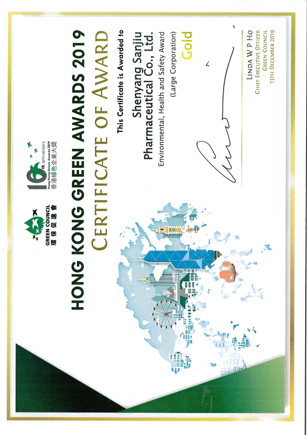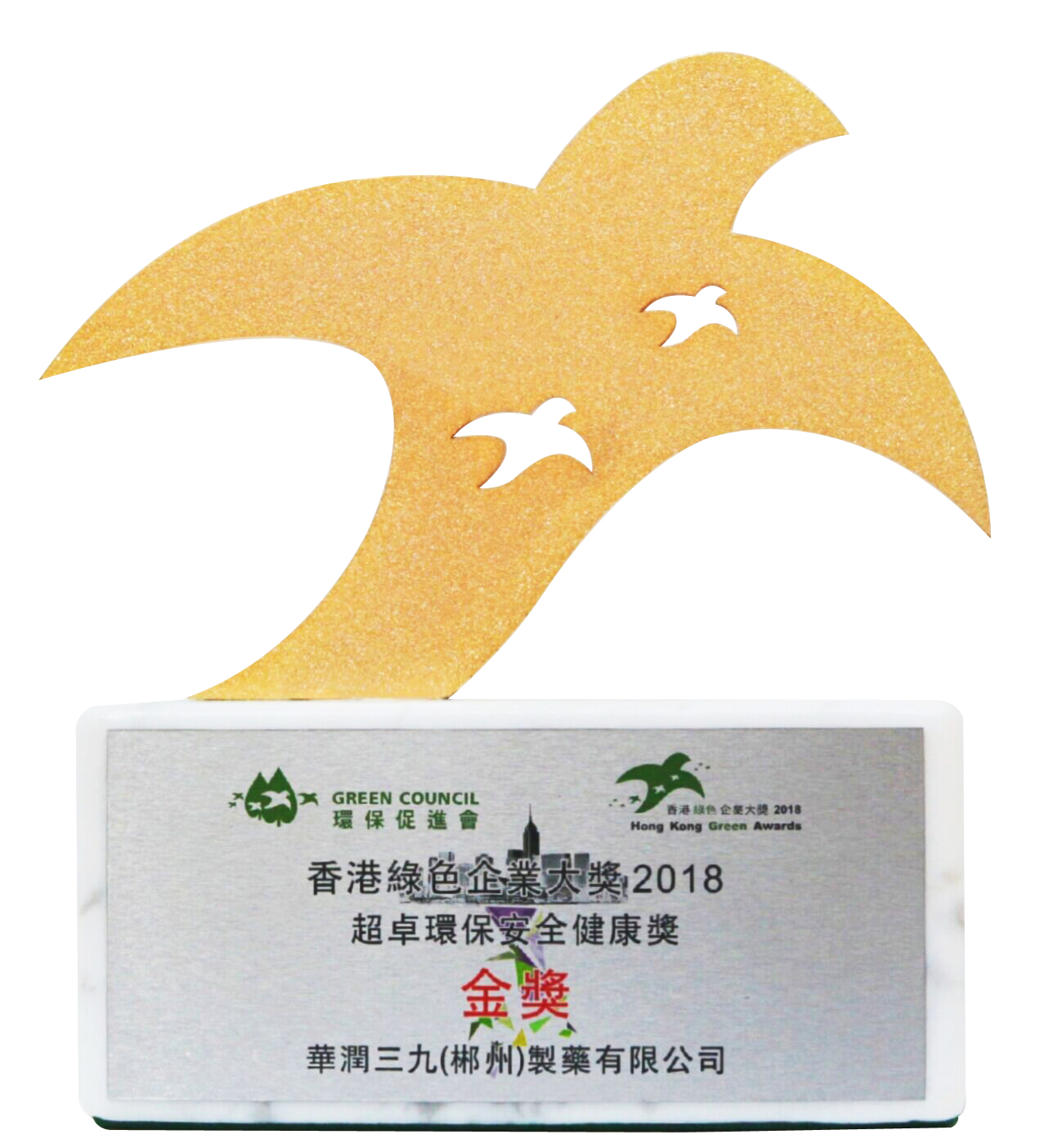 2019年12月,沈阳三九荣获香港环保增进会“香港绿色企业大奖-超卓环保清静康健奖”金奖。