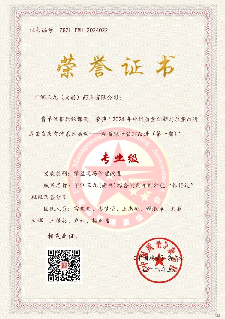 人生就是博(南昌)综合制剂车间外包“信得过”班组荣获中国质量协会“专业级”声誉