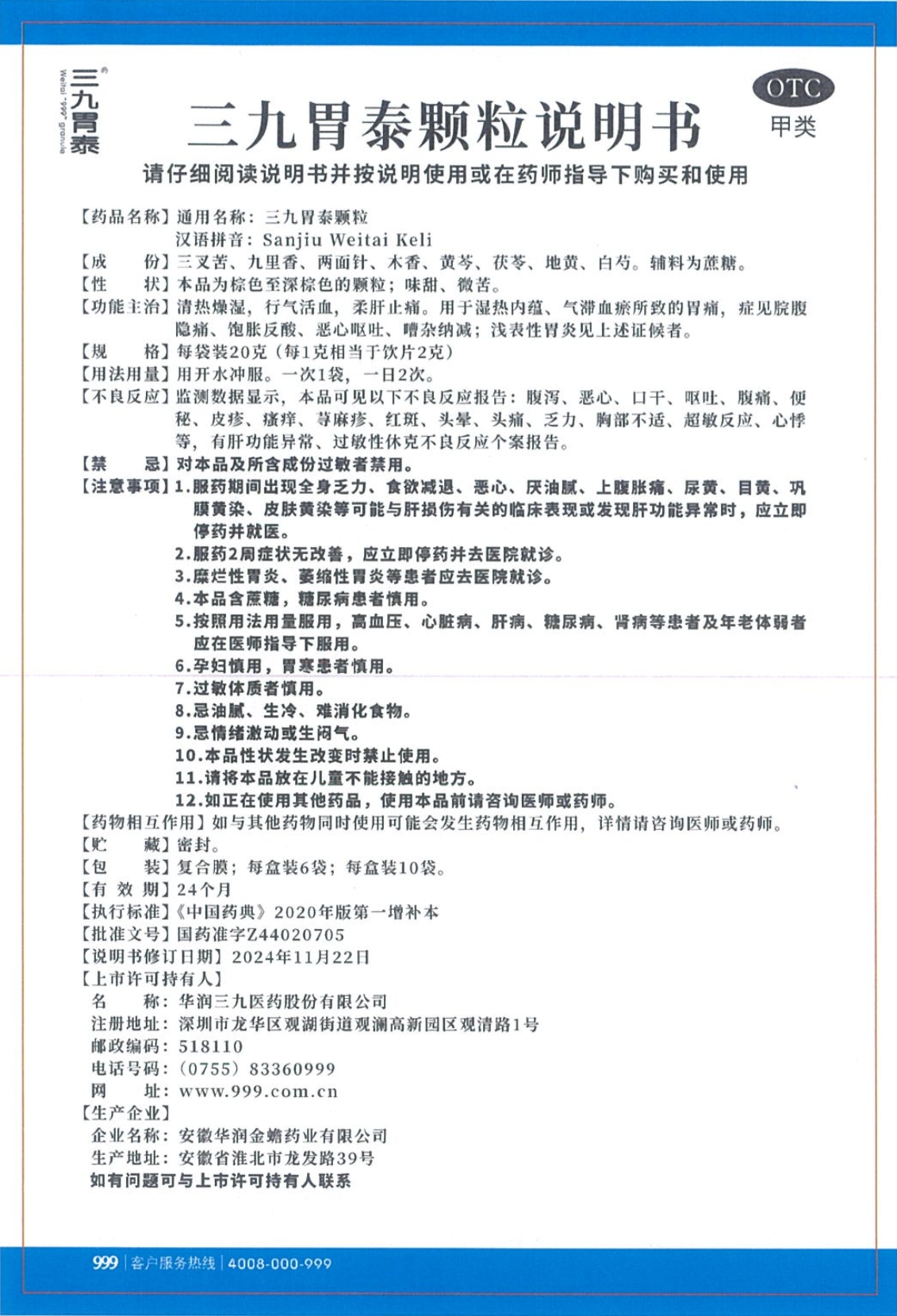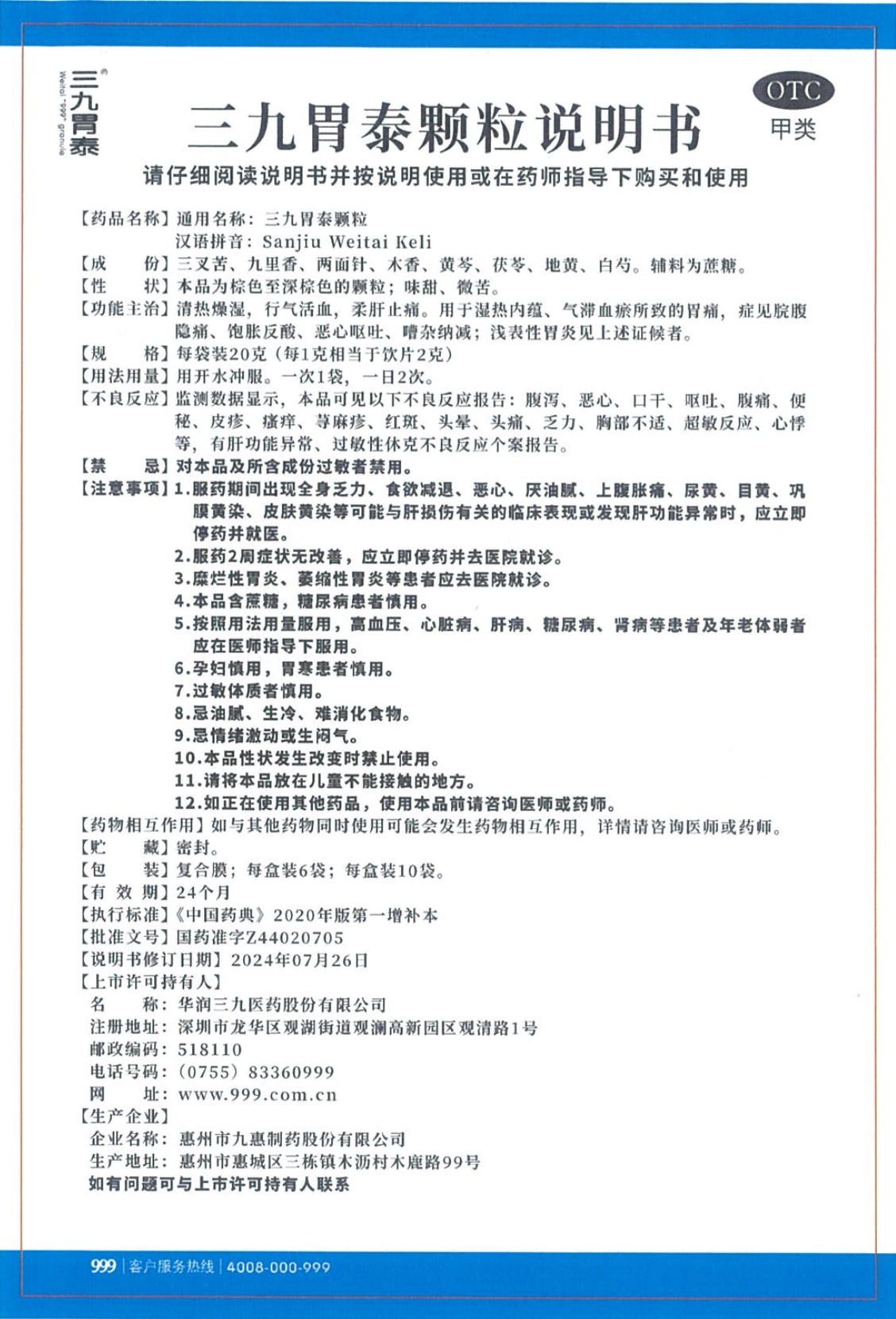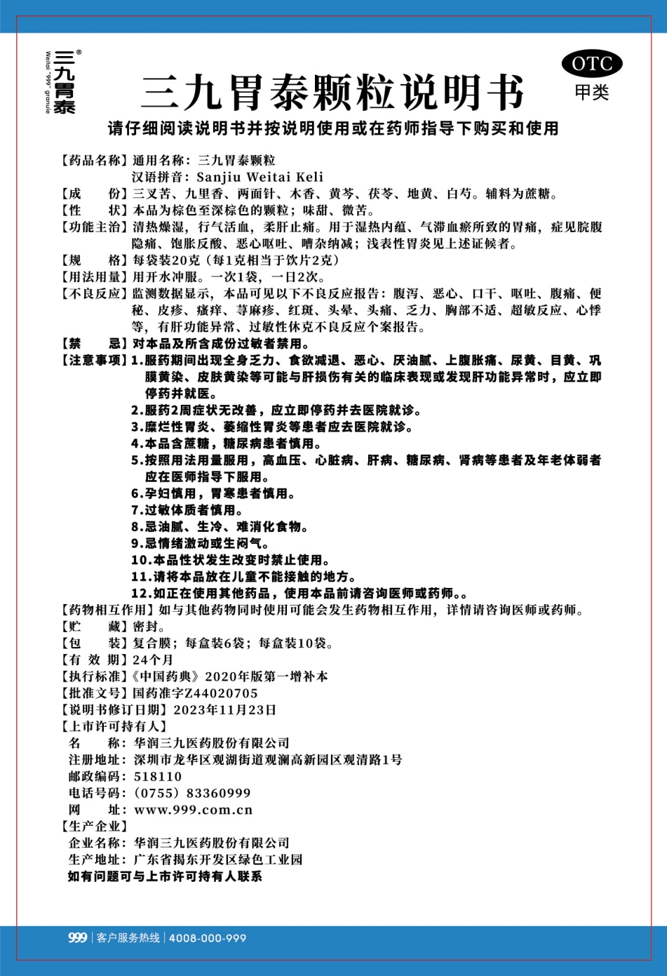 三九胃泰颗粒20g说明书[九惠三栋2501版、2025.01.16]
