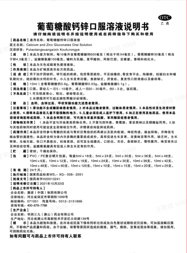 <dt>药品名称</dt><dd>葡萄糖酸钙锌口服溶液</dd>